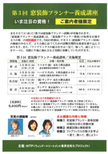 江口も講師を務めております窓装飾プランナー養成講座 第3回を迎え、回を重ねるごとに日本の窓を美しくするプロがめざめています。 お待たせいたしました! 高松・仙台での講座が追加決定です。 開催会場詳細は、窓装飾プランナー養成講座事務局までお問い合わせ下さい 0120-955-562(受付時間:平日10時~17時)