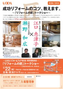 LIXILリフォームフェア新潟 特別講演会にて トークショーに参加致します。 事例映像を交えて、リフォームのポイントやアイディアを女性の視点でお話させて頂きます。 成功するリフォーム! きっとお役に立てる情報がありますので、是非足をお運びください 御待ちしております。