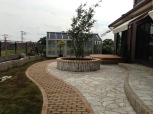 After 流れるような曲線でお庭の中にお散歩コース。素材の変化、花壇やテラスの高さの変化、パーゴラの木陰。どの場所も美しくどの場所も楽しく。