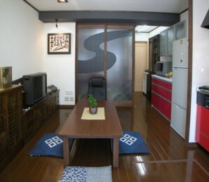 リフォームコンセプトマンション1階の店舗を住宅&店舗に。 機能性、デザイン、色へのこだわりを共存させたリフォーム。 床全体は通常より53cmあげて、全空間をバリアフリーに設計。 居住部分のカラーコーディネートは柿渋のダークな色調をベースに 朱色(キッチン、吊押入れ)と藍(小物、押入れLEDなど)を アクセントにした落着いた和テイスト |
