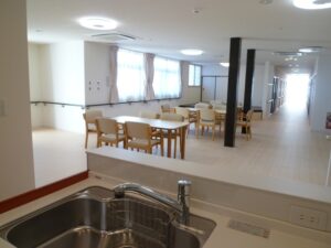 グループホームはいわば大きな家族! リビングには入居者、スタッフ、地域の方々が自然とあつまり、いつもにぎやか。 畳に腰かけながら、昔話に花が咲きます。 スタッフの方々の目線も考慮して、全体が自然と見渡せる間取りを心がけました。